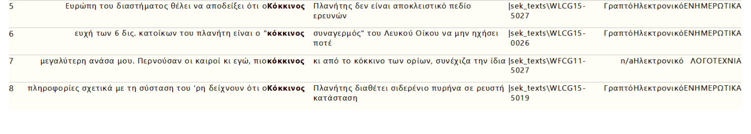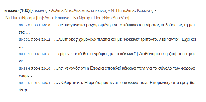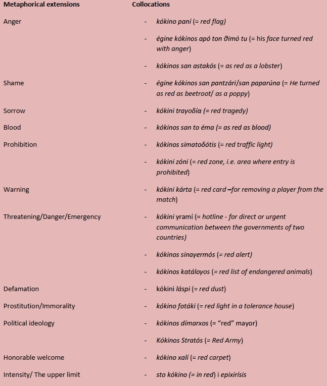This paper argues that electronic corpora provide a rich source of data and a useful tool for semantics. More specifically, collocations, semantic preference and semantic prosody of the basic colour term kókkinos ("red") in Modern Greek are examined, using text corpora, such as Greek electronic dictionaries, SEK (Corpus of Greek texts) and Educational Thesaurus of Greek Texts. The results of the research show that such a corpus-based analysis reveals the semantic and pragmatic aspects of language, the linguistic expression of emotion concepts, through conceptual metaphor and metonymy. Collocations with this term seem to reveal a high degree of semantic opacity in the framework of conceptual metaphor. In addition, kókkinos (red) is mainly related to negative semantic prosody, denoting for instance prohibition (kókini zóni = red zone, i.e. the area where entry is prohibited), danger/emergency (kókinos sinaγermós = red alert), prostitution/immorality kókino fotáki (= red light in a tolerance house) and negative emotions such as anger (kókinos san astakós = as red as a lobster), sorrow (kókini traγoδíα = red tragedy) and shame (égine kókinos san pantzári (= He turned as red as beetroot). The originality of the research lies in the emergence of the power of context and contextual factors in linguistic analysis, using naturally occurring instances and precise corpus techniques. Regarding the study limitations, the analysis is based on a specific set of corpora (Greek electronic dictionaries, SEK, and Educational Thesaurus of Greek Texts), which, while valuable, may not represent the full diversity of language use in informal, spoken, or contemporary digital contexts (e.g., social media, forums).