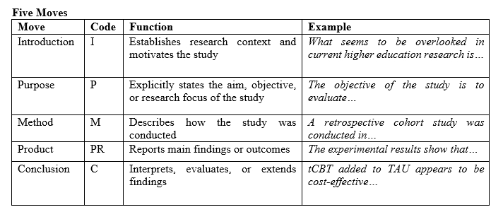 Relawati, M. and Basthomi, Y. (2021). The common move and step in research article abstracts [Unpublished doctoral dissertation]. State University of Malang.