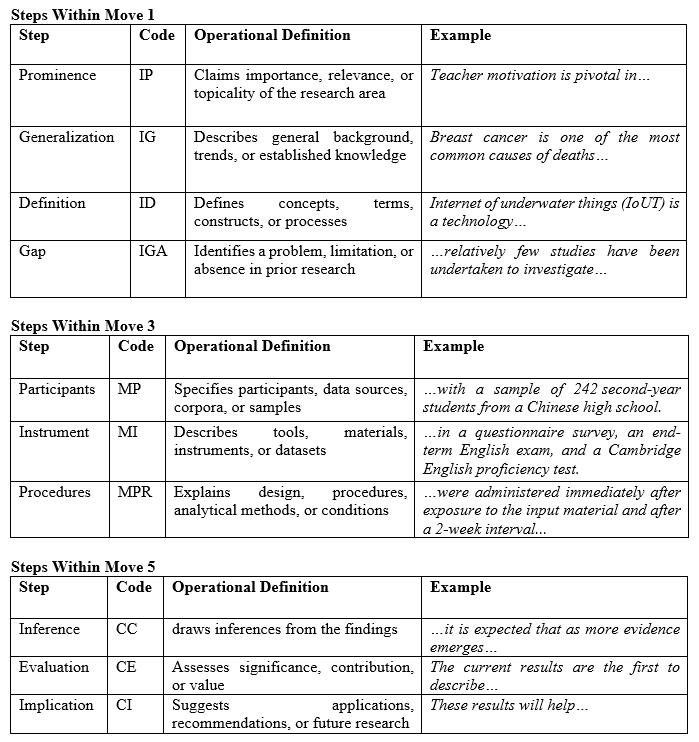 Khany, R. and Malmir, B. (2020). A move-marker list: A study of rhetorical move-lexis linguistic realizations of research article abstracts in social and behavioural sciences, RELC Journal, 51 (3), 381–396. https://doi.org/10.1177/0033688219833131