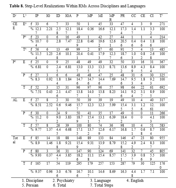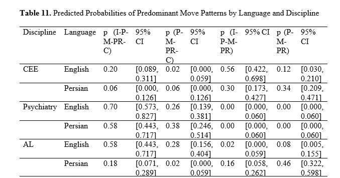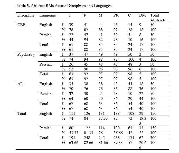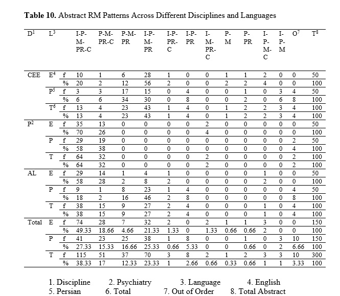 Researchers often have to develop abstracts in both English and their native language when intending to get their research articles (RAs) published in scholarly journals. Some, however, encounter challenges in this process, one of which is related to the rhetorical moves (RMs). This study endeavored to examine the RMs and steps of English and Persian RA abstracts recently published in top-tier journals across hard, medical, and soft disciplines. To this end, 150 English and 150 Persian abstracts from the disciplinary domains of Computers and Electrical Engineering (CEE), Psychiatry, and Applied Linguistics (AL), published in Scopus or Web of Science-indexed journals from 2022 to 2024, were selected, according to journal indexing, abstract policy, and availability. The corpus comprised primarily unstructured abstracts, with the exception of Psychiatry journals, which followed disciplinary conventions for structured formats. The abstracts were analyzed adopting Hyland's (2000) five-move framework. The findings suggested that the Product, Purpose, and Method moves were the most frequent in the abstracts (89.33%, 82.66%, and 81.66%, respectively). The most common RM pattern was the five-move organization of Introduction-Purpose-Method-Product-Conclusion (38.33%) in the RA abstracts. Inferential analyses revealed that the probability of observing the full pattern was over 0.70 in Psychiatry but only 0.20 in CEE, with Persian abstracts showing greater structural diversity. They also demonstrated that the Conclusion move was significantly more prevalent in Psychiatry abstracts than in CEE, and in English AL abstracts than in their Persian counterparts. Furthermore, the outcomes indicated that the abstracts typically contained an average of 5.86 steps, with the Purpose step being the most recurrent (16.76%), followed by the Product and Instrument steps (16.3% and 14.6%, respectively). Statistical modeling of steps identified significant language-discipline interactions, with the Definition and Conclusion steps showing the most pronounced variation. Additionally, it was found that the step pattern of the Prominence-Gap-Purpose-Participant-Instrument-Product-Implication was the most frequently used in abstract development. This study’s findings may give valuable insights into the patterns of English and Persian abstracts in various fields of study, which can be beneficial for English for Academic Purposes and academic writing courses.