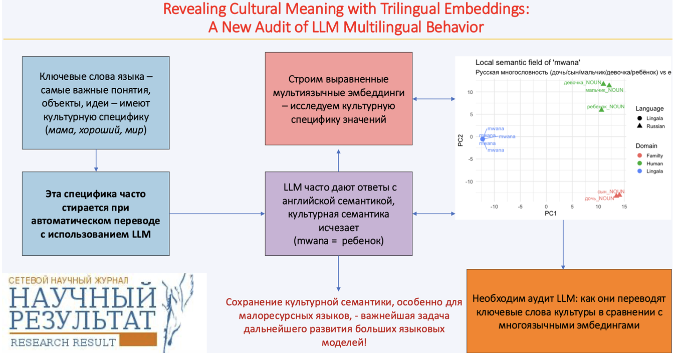 Мы утверждаем, что диагностика, основанная на эмбеддингах, является перспективным инструментом аудита многоязычного поведения LLM, особенно в контексте малоресурсных языков, чьи семантические категории рискуют быть поглощёнными семантикой английского языка. Настоящая работа очерчивает научную траекторию и призывает NLP-сообщество к более масштабным усилиям по защите языковой и культурной специфики в эпоху генеративного искусственного интеллекта.