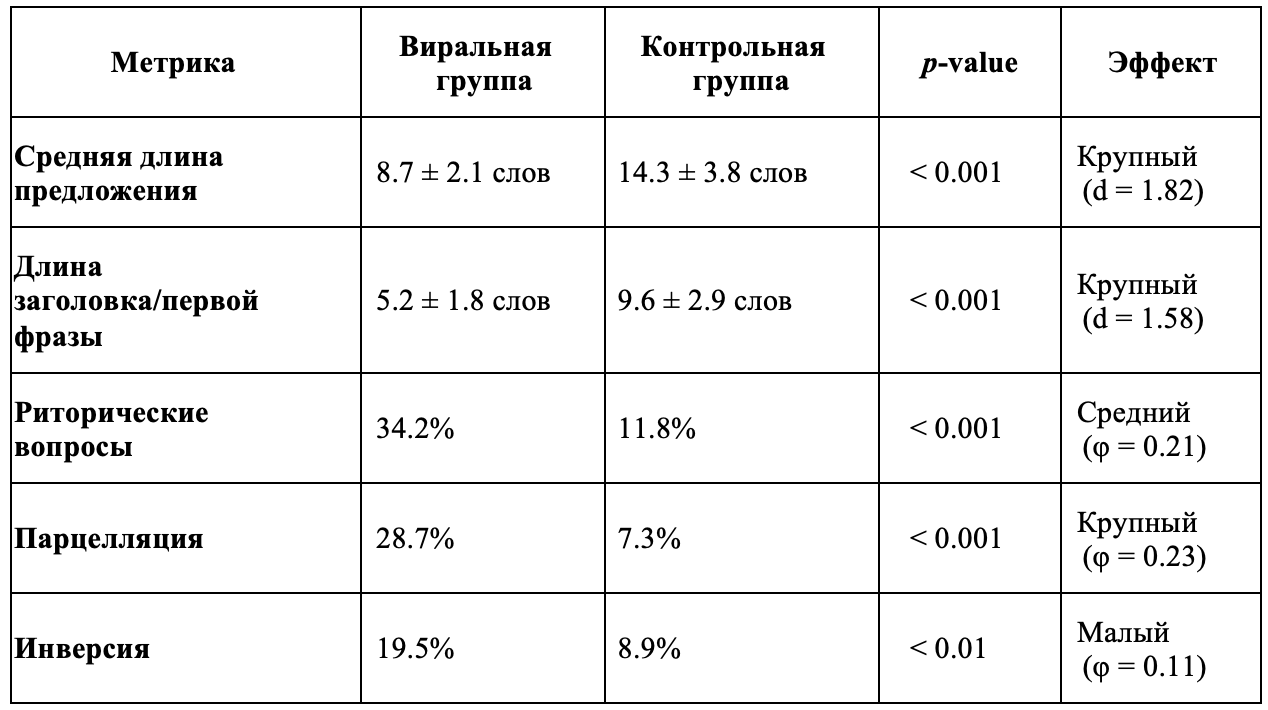 Статья посвящена лингвистическому анализу механизмов вирального распространения контента в условиях алгоритмически управляемой цифровой медиасреды. Актуальность исследования обусловлена трансформацией публичной коммуникации на цифровых платформах, где селекция и масштабирование сообщений все чаще осуществляются на основе формализуемых показателей вовлеченности, а не межличностных связей. Это требует пересмотра традиционных подходов к анализу публичной речи и разработки понятийного аппарата, учитывающего алгоритмическое опосредование дискурса. Проблема исследования заключается в выявлении устойчивых лингвистических характеристик алгоритмически усиливаемого контента и в описании структуры алгоритмического идиолекта – специфического речевого регистра, адаптированного к критериям платформенного отбора и ранжирования сообщений. Особое внимание уделяется соотношению формальных языковых средств, дискурсивной организации сообщений и метрик, используемых алгоритмами цифровых платформ. Исследование базируется на междисциплинарном подходе, сочетающем методы медиалингвистики, теории коммуникации и прикладного анализа данных. Эмпирическую базу составил корпус из 2000 постов социальных сетей (январь–июнь 2025 года), разделенных на виральную и контрольную подвыборки. В работе применялись количественные методы анализа, включая расчет средней длины предложений, частотности экспрессивных конструкций, автоматизированный анализ тональности текста и контент-анализ прагматических и мультимодальных элементов. Статистическая значимость различий проверялась с использованием t-критерия Стьюдента и χ²-критерия. Результаты показывают, что виральный контент характеризуется синтаксической редукцией, повышенной экспрессивностью, поляризацией тональности, ориентацией на бинарные оппозиции и высокой степенью мультимодальности, существенно повышающей вовлеченность. На основе совокупности выявленных признаков обосновано выделение алгоритмического идиолекта виральности как стандартизированного языкового регистра цифровой коммуникации, оптимизированного под алгоритмические механизмы платформ.